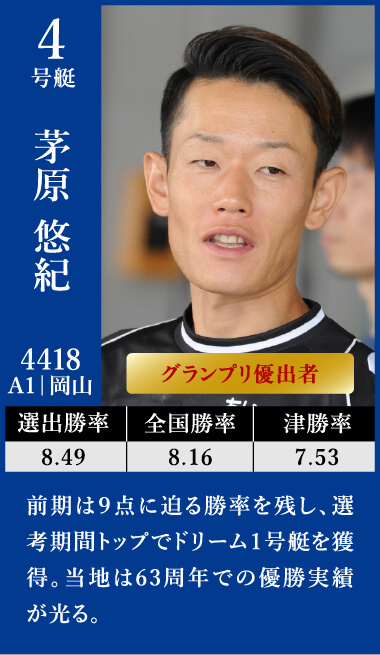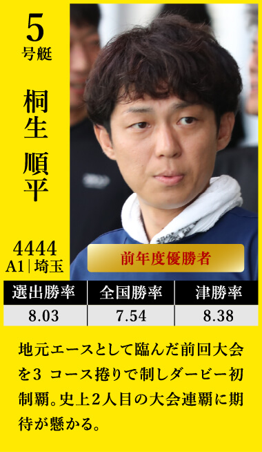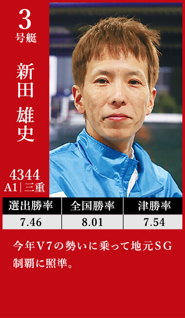 昨年8月から今年7月までの審査期間内で、8.49の最高勝率を残したのは茅原悠紀(岡山)。2年前に峰竜太が叩き出した8.63には及ばなかったものの、茅原の充実度を知るにはこの勝率をみれば一目瞭然。V最有力の位置づけは誰にも譲らないか。昨年の戸田大会は、桐生順平(埼玉)と佐藤翼(埼玉)が劇的な地元ワンツーを決めて幕を閉じた。桐生は1987~88年の今村豊(引退)以来となる史上2人目のダービー連覇へ挑戦だ。徳山オーシャンCで悲願のSG制覇を達成した西山貴浩(福岡)、東海地区で圧倒的な強さを誇る池田浩二(愛知)、もちろん峰竜太(佐賀)も戸田大会で1号艇V逸の悔しさを晴らしに来る。馬場貴也(滋賀)はダービー3年連続優出中、3年ぶりの覇権掌握へ始動だ。地元から唯一、新田雄史(三重)が出場権を得た。2013年チャレンジC以来となる地元SG。クールな男の鼓動は熱く、激しく脈を打つ。