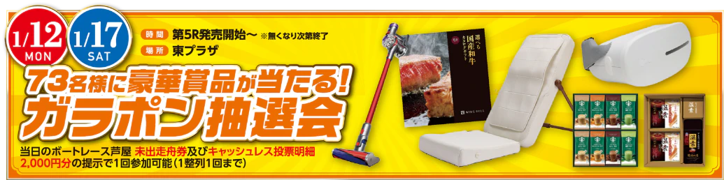 【内容】当日の未出走舟券もしくはキャッシュレス投票明細(芦屋本場のみ可)2,000円以上で参加できます。