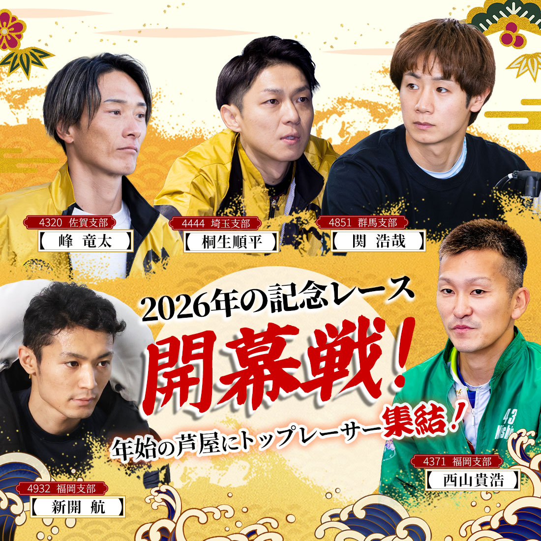 最注目はもちろん桐生順平だ。グランプリを2・2・1・1着で制して8年ぶりに黄金のヘルメットを奪還。2025年年間賞金王の称号も手にした。2025年の桐生は記念レースを22節走って11優出2Vという圧巻の成績。安定感抜群の走りが光った。そんな桐生だが芦屋はなぜか相性いまひとつ。過去16節走って1優出0Vだ。当地記念レースはこれまで10節出場して準優出5回、優出0回と不思議なほど苦戦が続いてきた。グランプリウィナーとして大きな注目を集めるなか臨む芦屋周年で、水面相性を払拭(ふっしょく)して当地記念初優出を飾るのか。