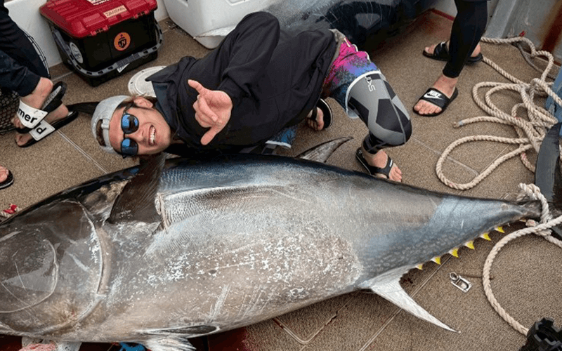 「一時期サーフィンにはまっていましたが、今はやっていません。魚釣りはしています。船から釣ったり、近くの防波堤や呼子の方に行ったりもします。釣りにはまったのは、魚が引くときの感覚ですね。糸を引くときのググッというバイブレーションの感覚がいい。唐津の堤防からは、アジやイカを狙います。釣れた魚やイカは自分でさばいて食べます。釣りは一人でも行きます。海を眺めながらの時間が、オンオフの切り替えじゃないですが、無になれます。唐津の海は魚種が豊富で、他の釣り場はかなわないと思います。今まで釣って一番大きかったのはマグロ(写真)です。壱岐の沖合でしたが、1時間くらいマグロと格闘していました。脂がすごく乗っていて、お肉みたいで、すごくおいしかった。次の日は筋肉痛になりましたけど(笑)」